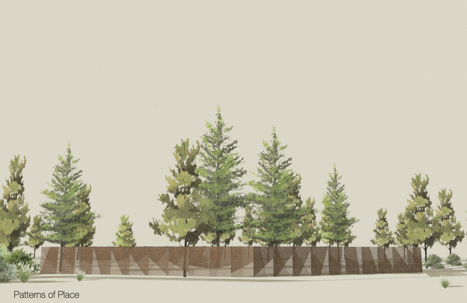 Ben Hull’s design, titled Patterns in Place, is drawn from the rugged beauty of Central Oregon’s high desert and the ever-shifting character of seasonal change. Patterns within the screen interpret the shifting textures of our four seasons that serve as an exterior screening for the Central Utility Plant Enclosure on the campus.
