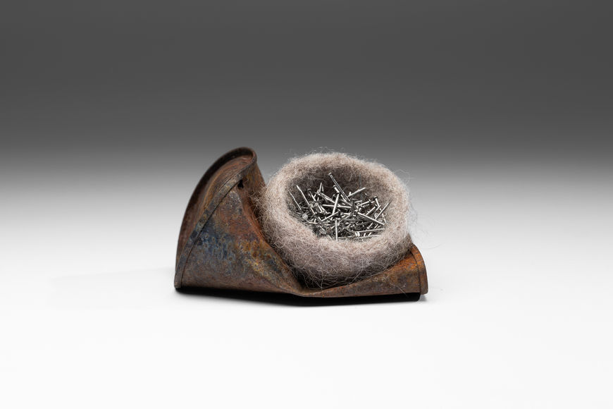 Inspired by how creatures build homes from whatever is at hand, Rabin combines found forms with plant and animal fibers to reimagine these unwanted objects as shelters—structures that might still protect, cradle, or hold. By transforming what is ruined into something resilient, the work asks how we might rebuild the structures in our lives that have been fractured. It imagines repair not as restoration to a previous state, but as an evolving, adaptive way forward.